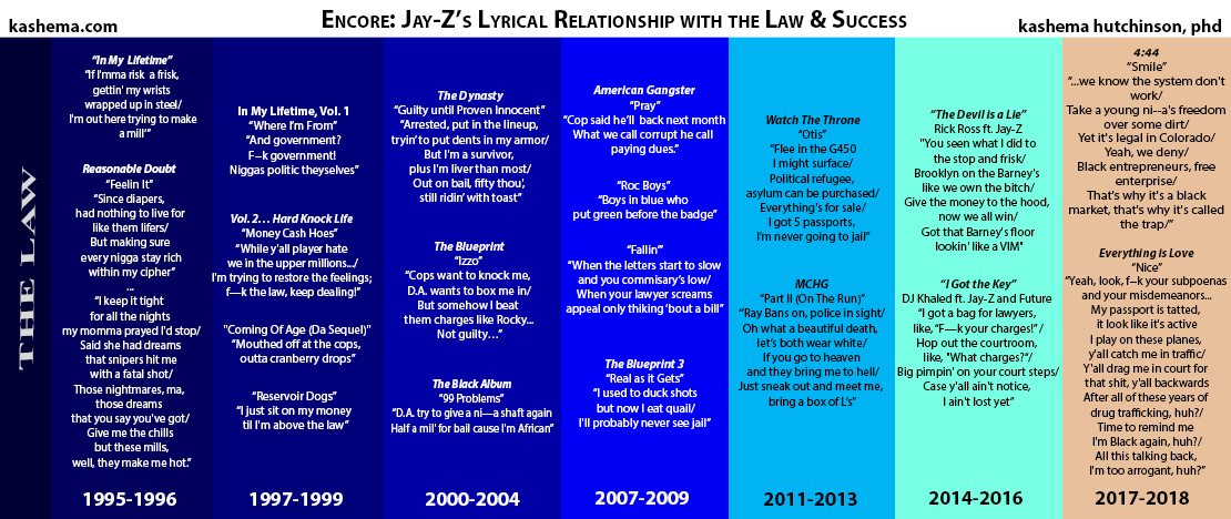 This infographic accompanies the analysis of Jay-Z’s relationship with the law and his successful music career from his first single “In My Lifetime” to his latest album, 4:44.