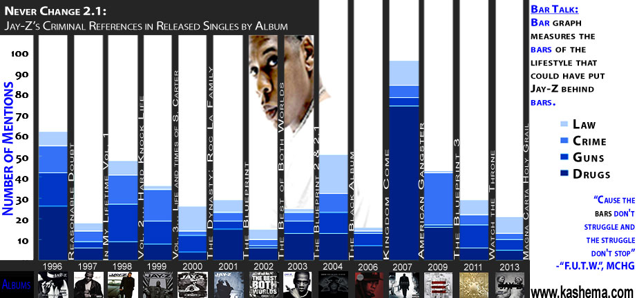 The infographic above is part of a study, Never Change 2.1. Never Change 2.1 is an analysis of Jay-Z’s lyrics to see if you take the man out of the hood, can you take the hood out of the man? Using the singles from Jay-Z’s albums, four themes were counted (drugs, guns, crime and the law) to analyze the lyrical changes as the MC from Marcy went from drug dealer to music mogul.